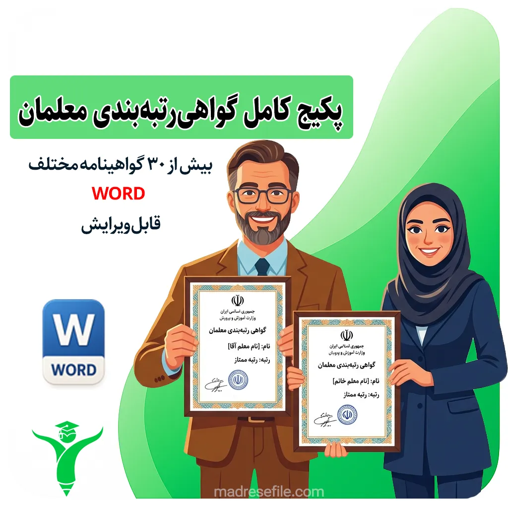 آیا به دنبال راهی مطمئن و کارآمد برای جمع‌آوری مستندات رتبه‌بندی معلمان و ارتقاء رتبه حرفه‌ای خود هستید؟ پکیج کامل گواهی‌های رتبه‌بندی معلمان، محصولی بی‌نظیر و جامع است که تمام نیازهای شما را در این مسیر برطرف می‌کند. این مجموعه ارزشمند شامل بیش از 30 نوع گواهی صلاحیت حرفه‌ای، عضویت در کمیته‌ها، شوراهای مدرسه و فعالیت‌های پژوهشی است که همگی در قالب فایل‌های Word کاملاً قابل ویرایش ارائه شده‌اند. دیگر نگران کمبود مدارک رتبه‌بندی معلم نباشید! با این پکیج، با اطمینان خاطر و صرفه‌جویی در زمان، امتیازات لازم را کسب کرده و به رتبه بالاتر دست یابید.